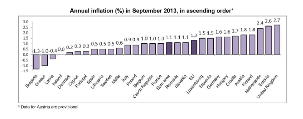 Here is a Eurostat chart showing Eurozone inflation rates by country as of September 2013: