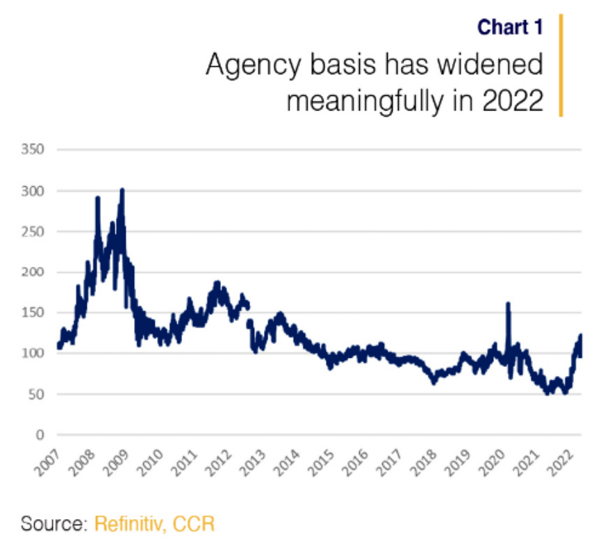 That is now beginning to play out. Chart 1 shows the spread between agencies and Treasuries has materially widened in light of the Fed’s more aggressive Quantitative Tightening plans