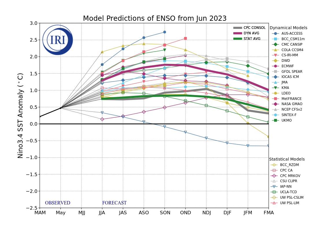 At least that is what pops out of the latest computer runs of the various dynamical and statistical models that IRI/Columbia Uni. present each month in the ENSO Forecast Quick Look.