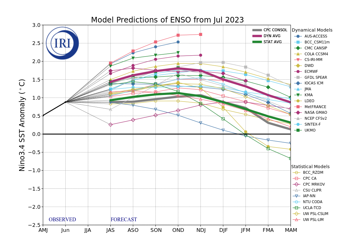 As of mid-July 2023, the previously weak El Niño conditions in the central-eastern equatorial Pacific have strengthened gradually to a weak-to-moderate El Niño. Key oceanic and atmospheric variables are consistent with the weak El Niño, although atmospheric variables, particularly SOI, are currently in the ENSO-neutral range. CPC issued an El Niño advisory in July 2023, signaling the presence of the warm phase of the ENSO. Almost all of the models in the IRI ENSO prediction plume forecast an El Niño event during boreal summer, continuing into boreal autumn and winter, while weakening during the boreal spring of 2024....