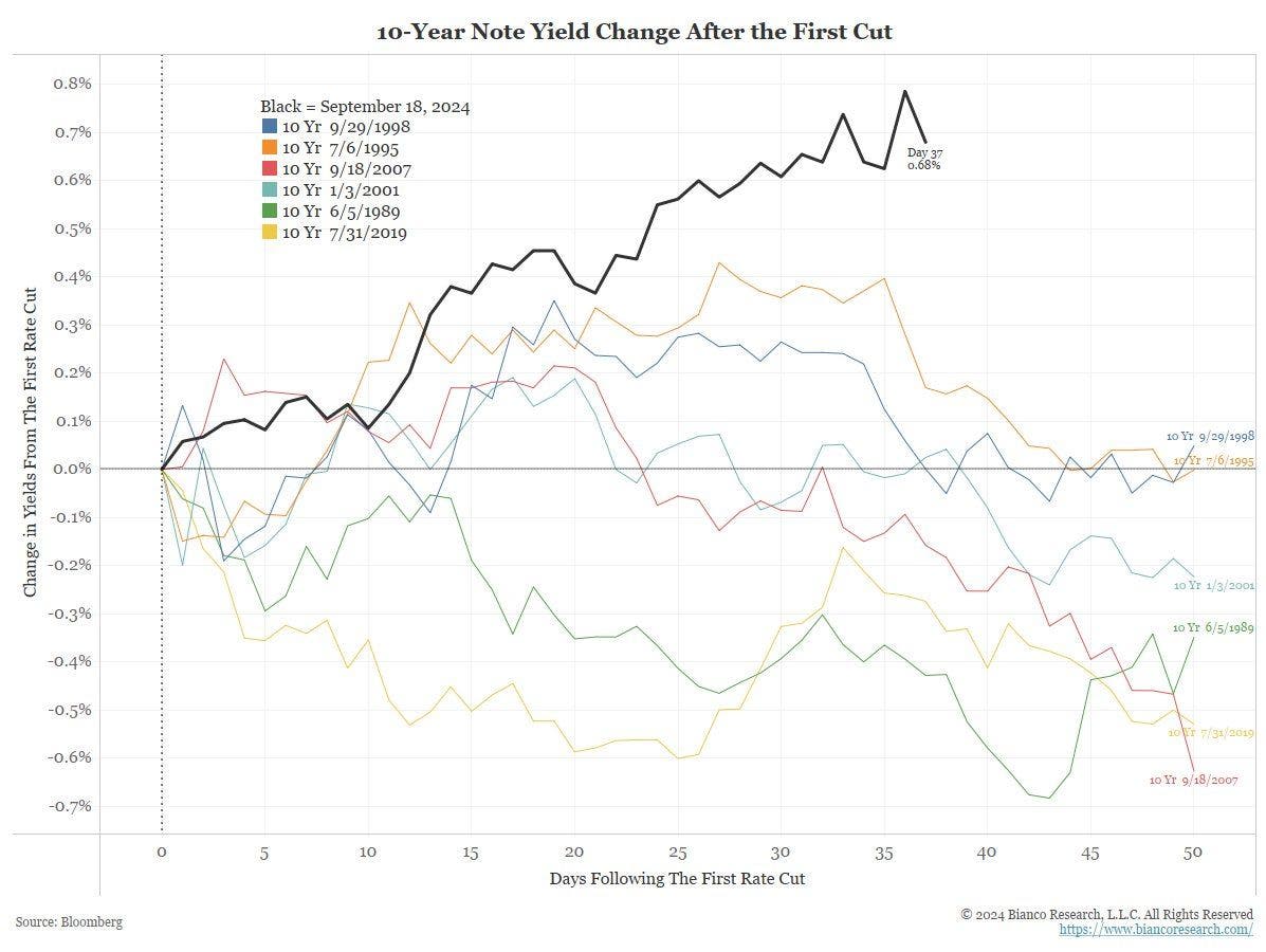 Yes, cutting rates now might be even worse than the policy error when the Fed thought inflation was largely ‹transitory›. They started off with a 50 basis points cut, signaling a pivot towards further meaningful easing of monetary policy. Chicago Fed President Austan Goolsbee essentially confirmed this the week after in late September, indicating that interest rates must be slashed by hundreds of basis points to reach a neutral policy stance. So I guess the market already started thinking to itself that all these rate cuts aren’t really needed in light of the robust economic data, and if the Fed is following through, it’s time to worry about inflation again because they might overstimulate the economy.