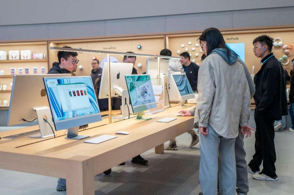 Consumers experience Apple products at an Apple store in Jing'an, east China's Shanghai. (People's Daily Online/Wang Chu)
