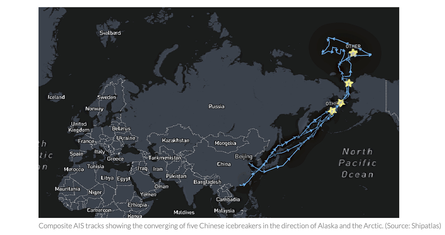 The flotilla is led by China’s largest domestically-built icebreaker Xue Long 2. The Polar Class 3 vessel departed from Shanghai on July 5. It has since been operating in the Chukchi and Beaufort Seas adjacent to Alaska and Russia. Its ultimate destination is not currently known. Last summer the vessel concluded its Arctic sailing with a port visit to Russia’s largest Arctic city Murmansk. Both the U.S. Coast Guard and Canadian military have shadowed Xue Long 2’s activities in recent weeks.