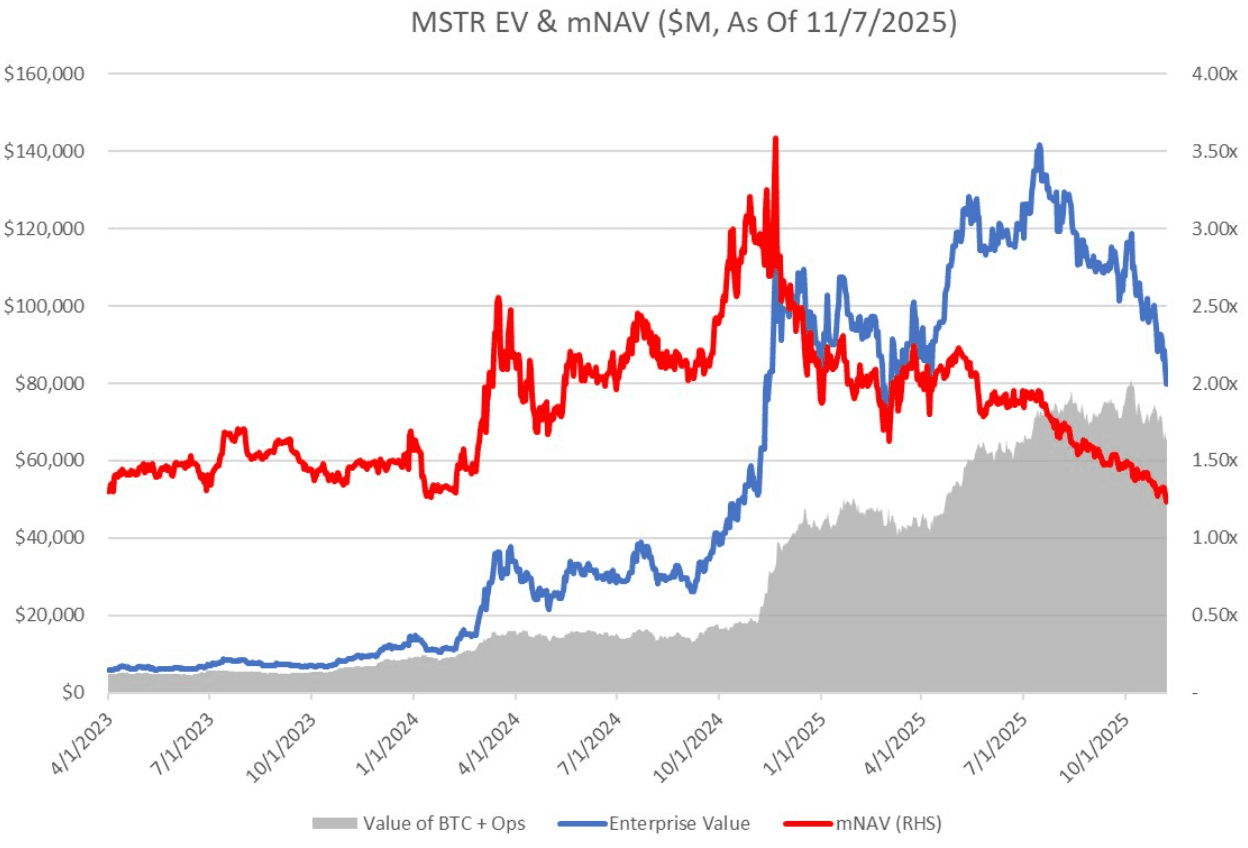At the time, Michael Saylor’s flagship bitcoin vehicle was soaring at 2.5 times the market value of its bitcoin holdings. After a major correction in the shares compared to a much smaller decline in bitcoin, that market capitalization to net asset value multiple has shrunk to around 1.23 times.