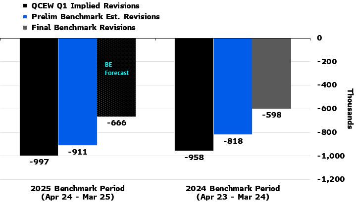 Now, as a reminder, the BLS's preliminary estimate of the benchmark payrolls revision indicated that cumulative payroll growth between April 2024 and March 2025 would be revised 911k lower, though as in previously occasions, the final downward revision will likely be smaller, and the result will be that tomorrow we will learn that in the period April 2024 - March 2025 the US actually created 750-900k fewer jobs.